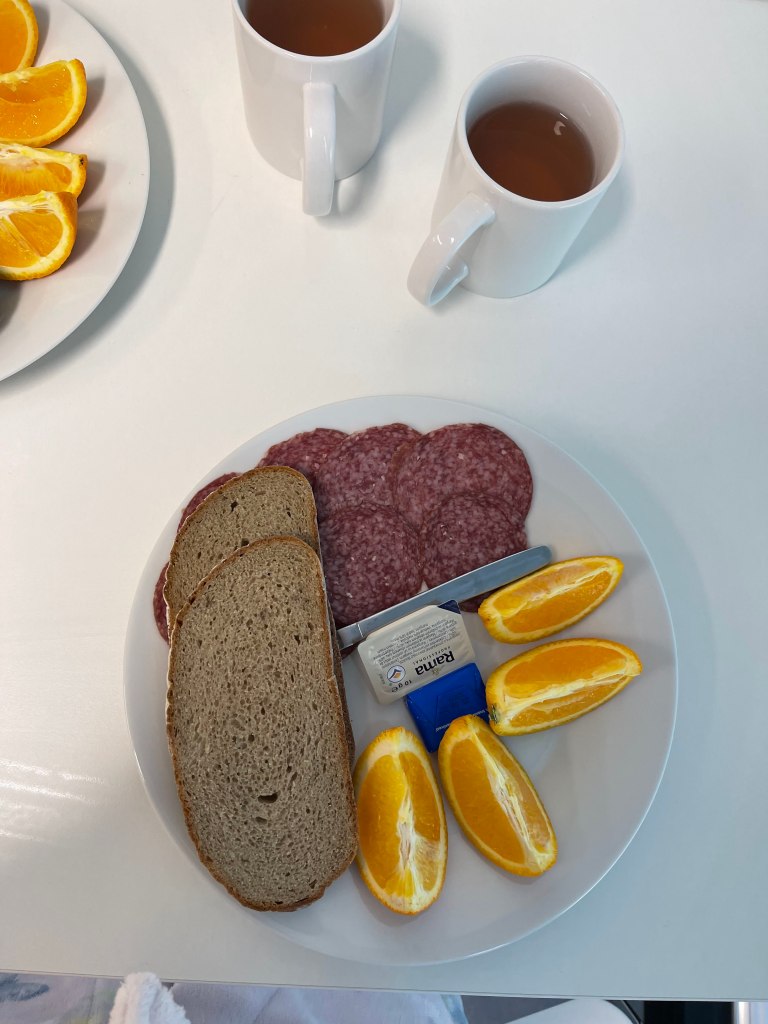 Na večeři je ŽEMLOVKA! Asi poslední jídlo, které bychom si obě daly :D. Ale tak co už…Všechny sestřičky byly moc milé, večer jsem dostala prášek na spaní (nabízely mi i prášek od bolesti, ale nebyl potřeba). Verča mi ještě udělala psychoterapii (haha, hodně jsem se vymluvila ze všeho❤️). V noci jsem se poměrně fajn vyspala a na snídani byl salám s pomerančem :D.